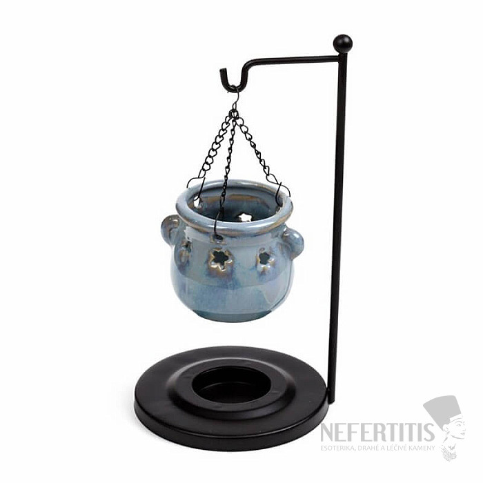 Závěsná aroma lampa Modrý kotlík zaujme originálním designem s kotlíkem zavěšeným ve stojanu, který vytváří jedinečný vizuální efekt lehkosti a rovnováhy. Modrý odstín působí harmonicky, uklidňujícím dojmem a přináší do prostoru pocit svěžesti a klidu.