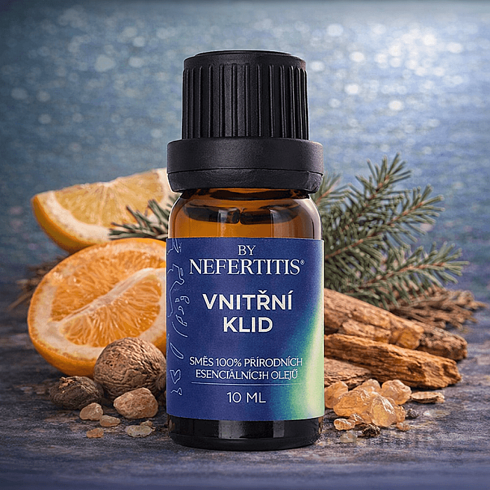 By Nefertitis Vnitřní klid je rituální aromaterapeutická směs 100% esenciálních olejů z muškátového oříšku, sladkého pomeranče a himálajského cedru. Vznikla jako jedinečná kompozice v naší kouzelné dílně By Nefertitis s cílem vytvořit prostor pro zklidnění, uvolnění a návrat k vnitřní rovnováze. Teplé kořeněné tóny muškátu se propojují s jemnou citrusovou radostí pomeranče a hlubokým, stabilizujícím charakterem cedru, čímž vzniká harmonická, hřejivá a uklidňující vůně.