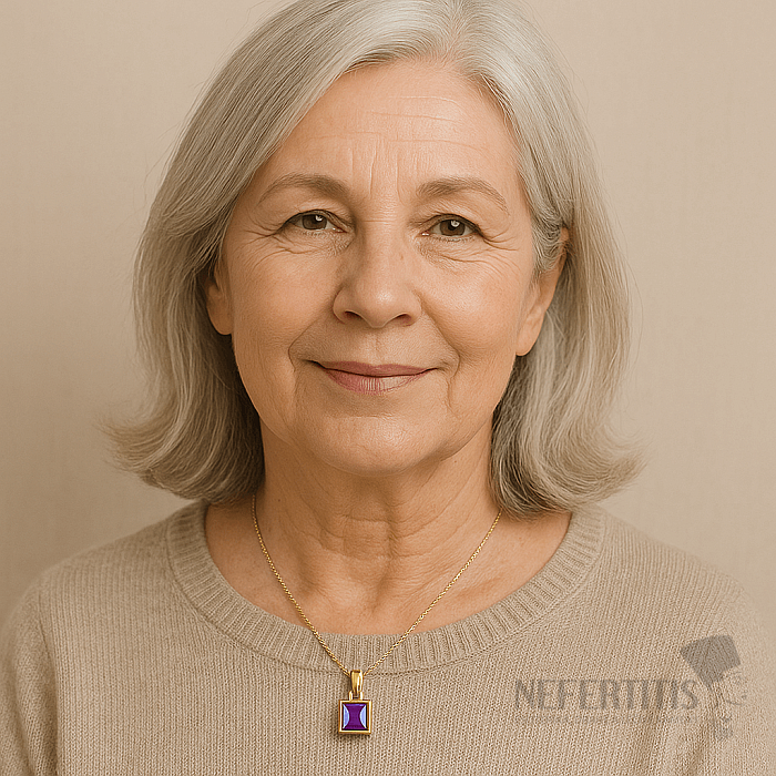 Tento elegantní přívěsek z pravého stříbra 925/1000 je potažen vrstvou 14k zlata, které mu dodává teplý, luxusní vzhled. Hlavním prvkem je přírodní ametyst o velikosti přibližně 7 mm, zasazený do obdélníkové obruby a vybroušený kvalitním emerald (step) brusem, jenž zvýrazňuje jeho fialové odstíny a průzračnost.