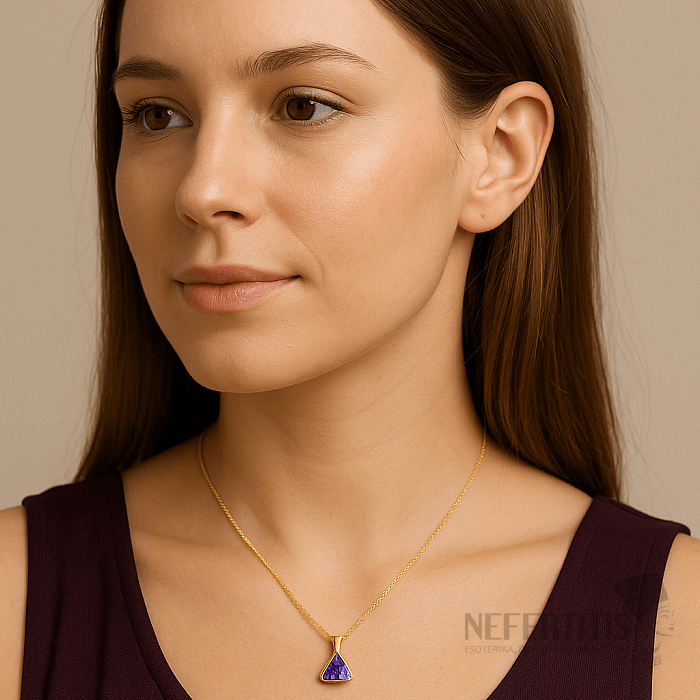 Tento stylový pozlacený přívěsek z kolekce Concetta je vyroben z kvalitního stříbra 925/1000, které je pokryto vrstvou 14k zlata pro trvanlivý, teplý a elegantní lesk. Dominantou šperku je přírodní ametyst o velikosti přibližně 6 mm, broušený do moderního trilliant (trojúhelníkového) brusu. Tento specifický tvar s ostře řezanými facetami podtrhuje jeho hlubokou fialovou barvu a dodává přívěsku výjimečnou jiskru.