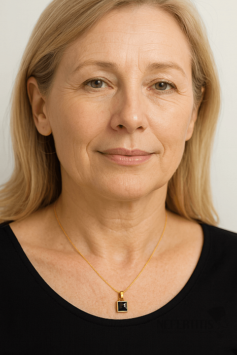 Tento nadčasový přívěsek je vyroben z pravého stříbra 925/1000 a je pokryt vrstvou 14k pozlacení, které dodává šperku teplý, elegantní odstín. Dominantním prvkem je přírodní černý spinel o velikosti přibližně 6 mm, vybroušený do geometricky přesného čtvercového tvaru s facetovým brusem, jenž zajišťuje výrazný zrcadlový efekt typický pro tento vzácný minerál.