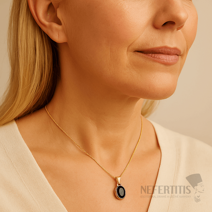 Dominantou přívěsku je přírodní černý spinel o velikosti přibližně 8 mm, vybroušený do oválného tvaru s kvalitním facetovým brusem, který vytváří jemné odlesky a dodává kameni hloubku i eleganci.