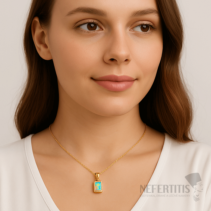 Dominantou přívěsku je přírodní etiopský opál o velikosti přibližně 7 mm. Kámen má obdélníkový tvar s emerald facetovým brusem, který nádherně pracuje se světlem a rozprostírá v kameni typickou hru barev – od zelené a modré až po žlutou a růžovou. Etiopský opál je ceněný pro svou intenzivní luminiscenci, díky níž působí téměř magicky.