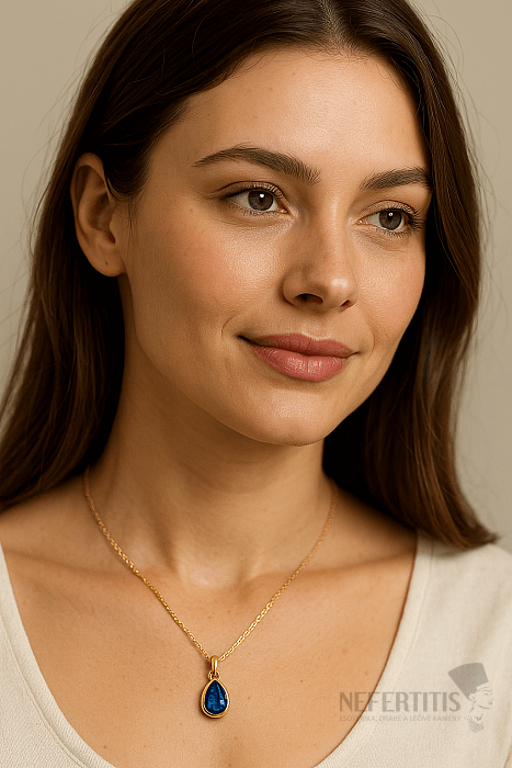 Dominantou šperku je přírodní modrý kyanit o velikosti přibližně 8 mm, zasazený do hladké bezkrapnové obruby. Kámen má kapkový tvar (pear shape) a precizní facetový brus, který zvýrazňuje jeho charakteristické modré tóny s jemnými světelnými odlesky. Kyanit patří mezi výrazné minerální kameny s osobitým vnitřním leskem a krásnou přírodní kresbou.