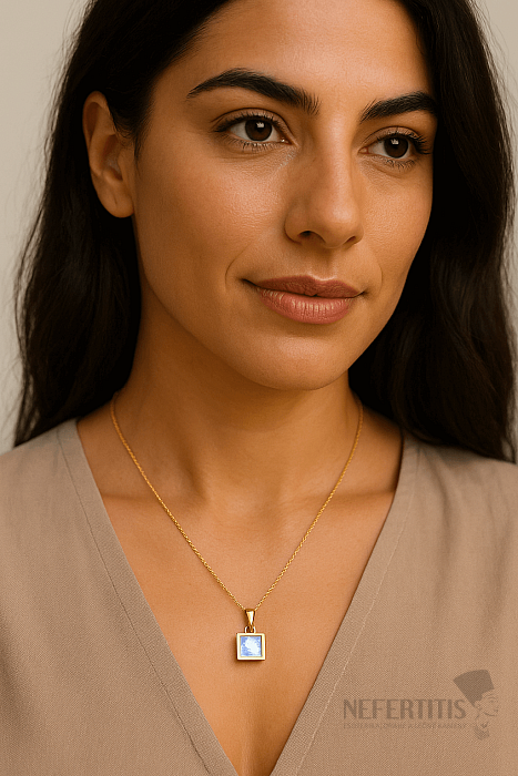 Tento jemný přívěsek z kolekce Concetta je vyroben z pravého stříbra 925/1000, které je zdobeno trvanlivou vrstvou 14k zlata pro teplý a luxusní odstín. Dominantou šperku je přírodní duhový měsíční kámen o velikosti přibližně 5 mm, zasazený do ladného čtvercového tvaru s jemným, ručně broušeným facetovým brusem, který podtrhuje jeho typickou barevnou iridescenci.