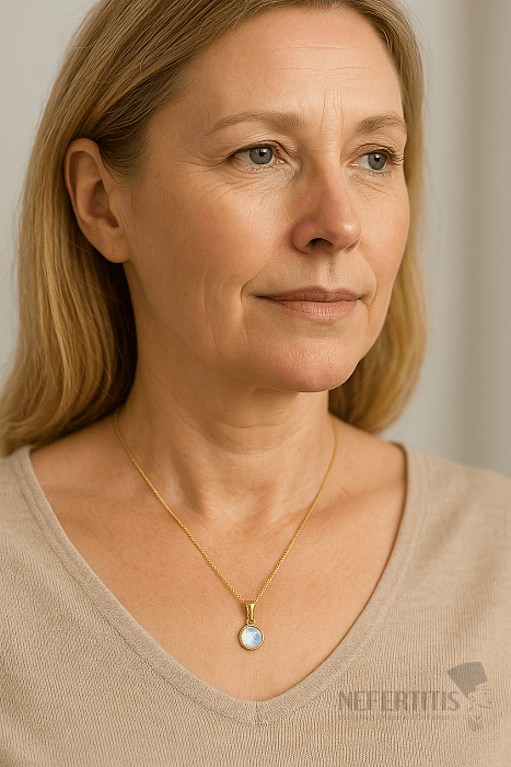 Tento jemný přívěsek z kolekce Concetta je vyroben z kvalitního stříbra 925/1000 se silnou vrstvou 14k pozlacení, které dodává šperku teplý a luxusní tón. Dominantou je přírodní duhový měsíční kámen o velikosti cca 5 mm, vybroušený do dokonale kulatého tvaru s facetovým brusem. Právě tento brus přispívá k jeho typickému optickému efektu – jemné modravé až duhové záři, známé jako adularescence.