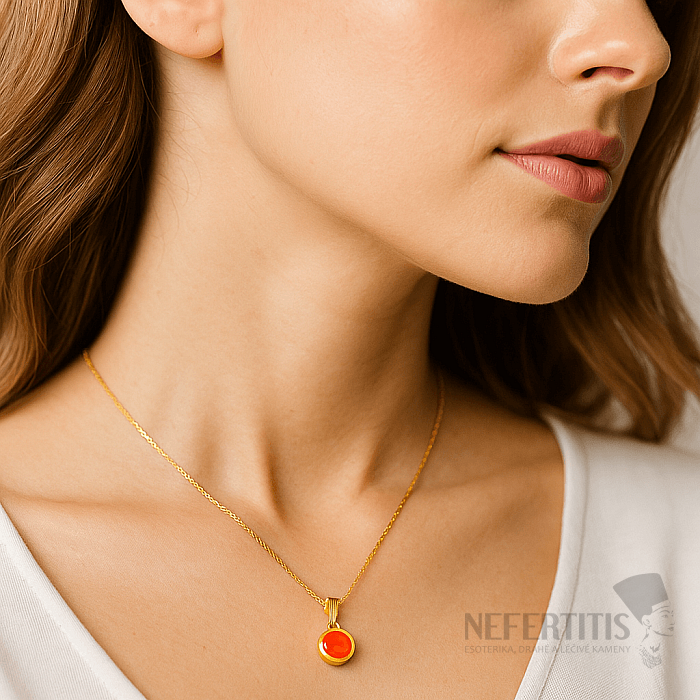 Dominantou šperku je přírodní broušený kámen karneol o průměru 6 mm, zasazený do precizně zpracovaného pozlaceného lůžka, které zvýrazňuje jeho sytou oranžovo-červenou barvu. Přívěsek váží pouhých 0,5 g, je tedy velmi lehký, pohodlný a vhodný pro každodenní nošení.