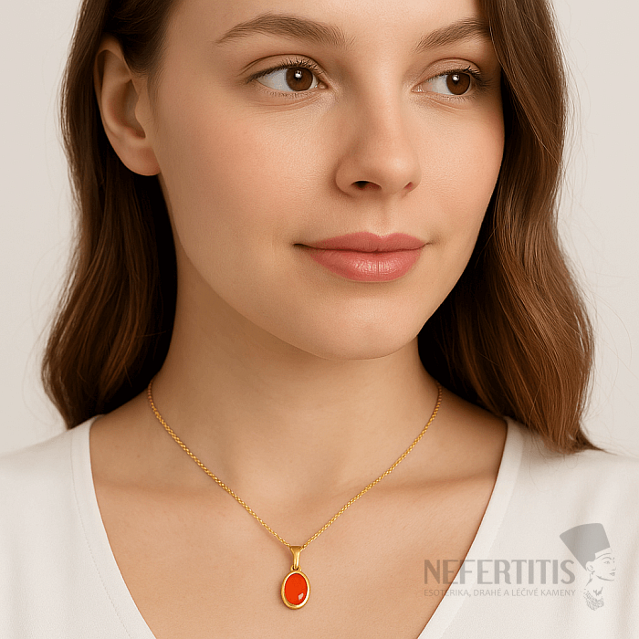Dominantou šperku je přírodní broušený kámen karneol o velikosti 8 mm, zasazený do precizně zpracovaného pozlaceného lůžka, které zvýrazňuje jeho sytou oranžovo-červenou barvu. Přívěsek váží pouhých 0,5 g, je tedy velmi lehký, pohodlný a vhodný pro každodenní nošení.