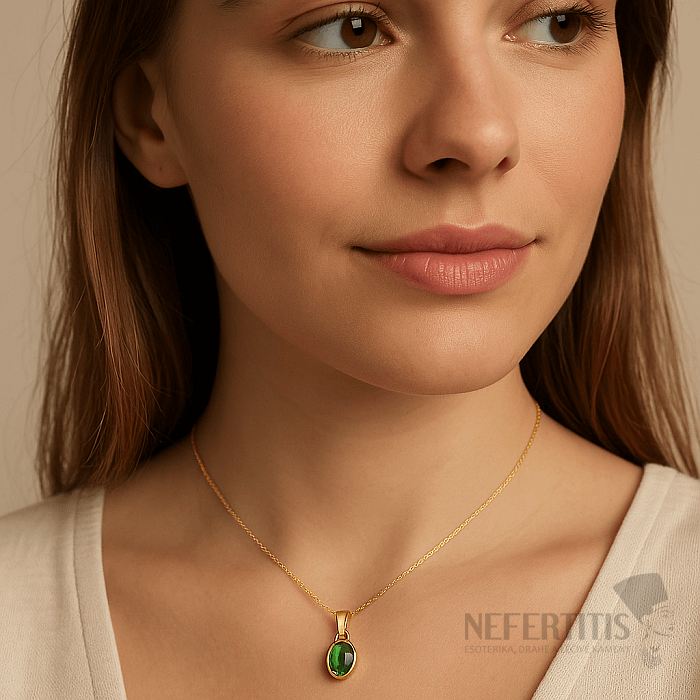 Dominantou přívěsku je přírodní broušený zelený kyanit o velikosti cca 8 mm, zasazený v precizně vyhotovené oválné obrubě. Tento kámen je známý svými fascinujícími zelenými odstíny i jemnými světelnými odlesky, které vyniknou při každém pohybu.