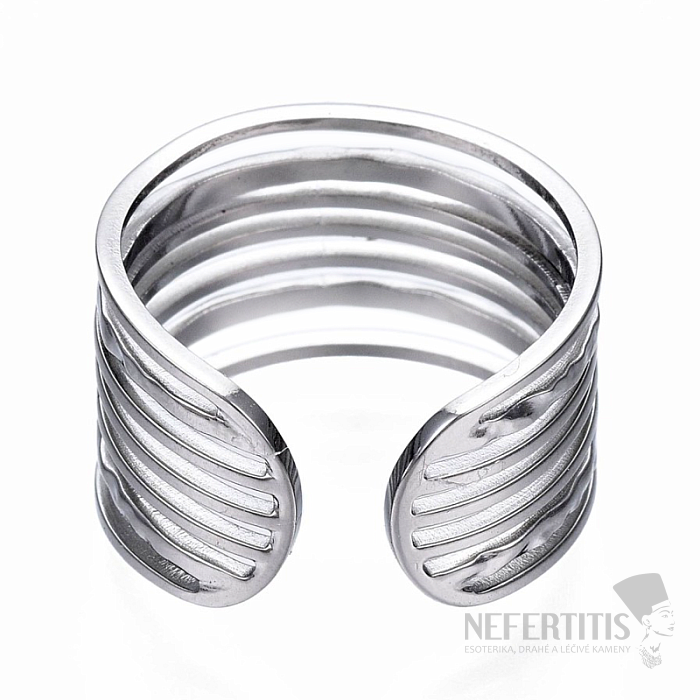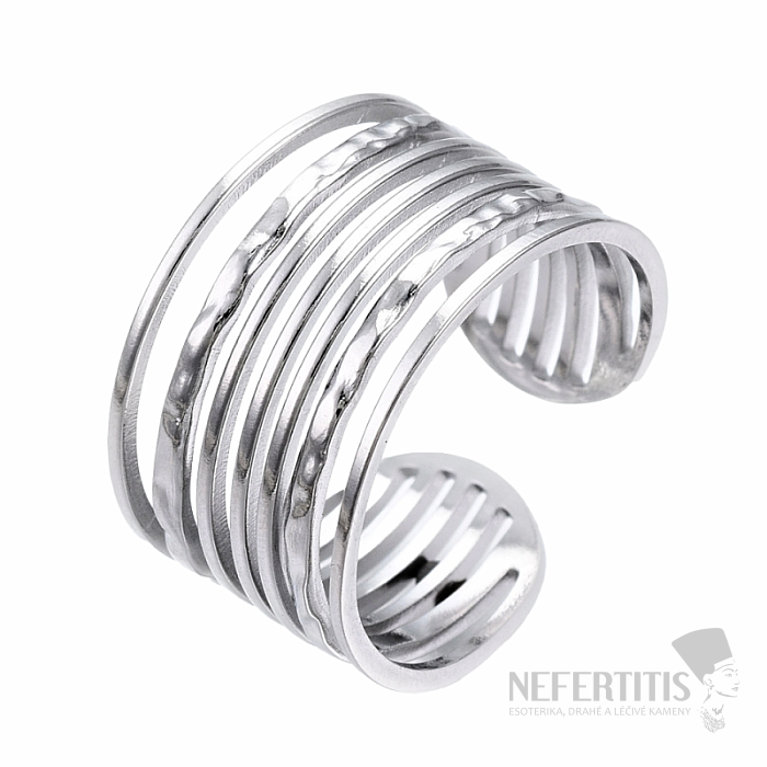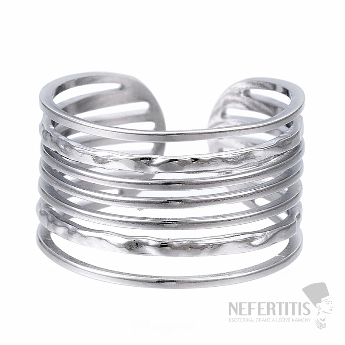 Dámský prsten z ušlechtilé nerezové oceli Silver multistrand. Elegantní dámský prsten vyrobený z kvalitní ušlechtilé nerezové oceli v moderním provedení multistrand. Stříbrný vzhled prstenu působí nadčasově, díky čemuž se skvěle hodí jak pro každodenní nošení, tak i pro slavnostní příležitosti. Nerezová ocel je oblíbená pro svou odolnost vůči poškrábání, korozi i ztrátě lesku, proto se prsten dlouhodobě pyšní krásným vzhledem bez nutnosti speciální údržby. Design složený z více proužků vytváří efekt decentní extravagance a dodá vašemu outfitu jedinečný šmrnc. Šíře prstenu: cca 0,8 až 1 cm. Materiál: nerez ocel. Ilustrativní vyobrazení.