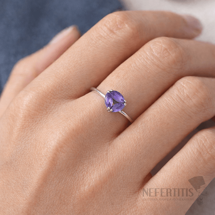 Prsten je osazen třemi přírodními kameny ametystu o velikosti cca 5 mm. Kameny mají oválný tvar (marquise/ovál) a jsou vybroušeny do precizního fasetového brusu, který podtrhuje jejich třpyt a hloubku barvy.