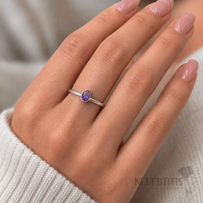 Dominantou prstenu je přírodní ametyst o velikosti přibližně 8 mm, zasazený do hladké obruby a vybroušený do tvaru kapky (pear) s precizním fasetovým brusem, který zvýrazňuje jeho třpyt a hloubku barvy.