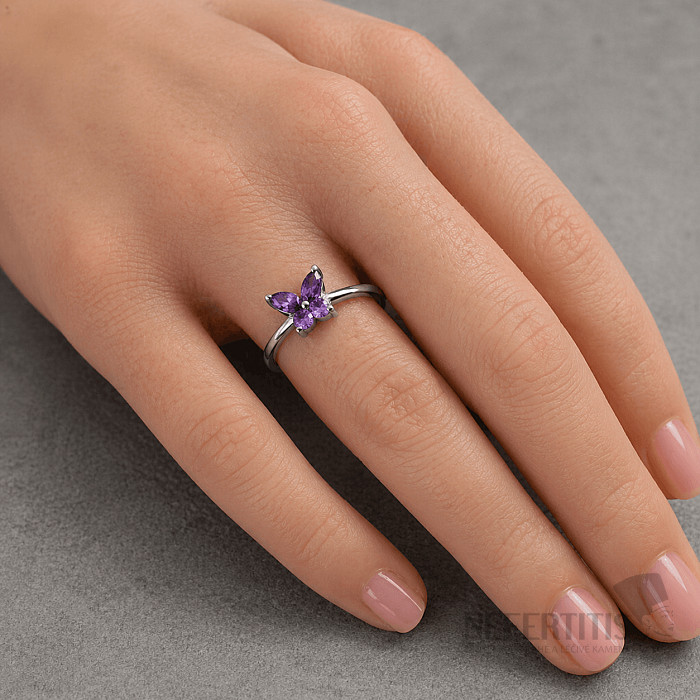Tento stříbrný prsten s ametystem ve tvaru motýla je jedinečný šperk, který spojuje krásu přírodního kamene s jemným a moderním designem.