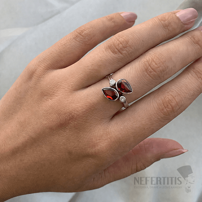 Dominantou prstenu jsou dva výrazné kameny přírodního granátu o velikosti cca 8 mm, vybroušené do protáhlého tvaru markýza (marquise) s precizním fasetovým brusem, který zvýrazňuje jejich hloubku a intenzivní červený lesk.