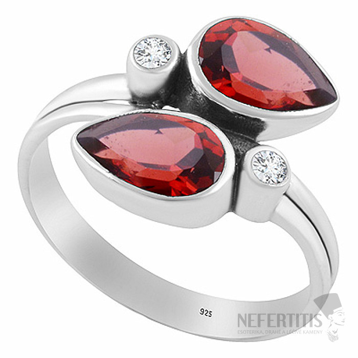 Granát zaujme svou sytou vínově červenou barvou, která symbolizuje vášeň, energii a eleganci. Kombinace s čirými zirkony vytváří harmonický kontrast, díky kterému je tento dámský stříbrný prsten s granátem výrazný, ale zároveň vkusný doplněk.