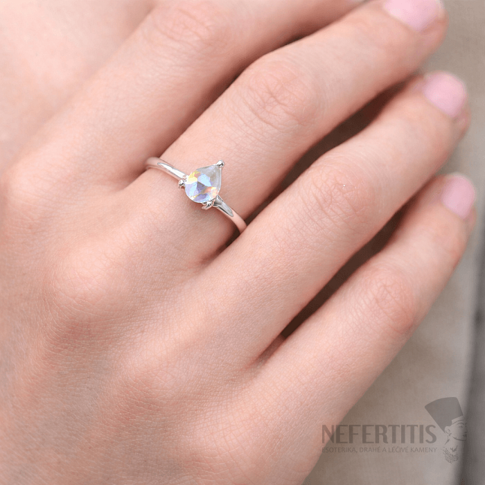 Dominantou prstenu je přírodní měsíční kámen o velikosti přibližně 7 mm, vybroušený do tvaru kapky (pear) s precizním fasetovým brusem, který zvýrazňuje jeho typický optický efekt – jemnou duhovou záři (adularescenci).