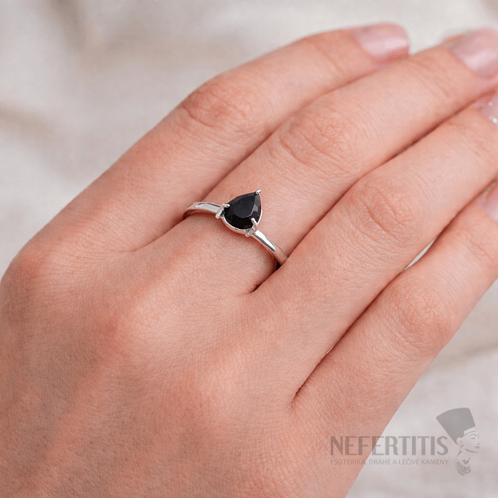 Dominantou prstenu je přírodní černý onyx o velikosti přibližně 7 mm, vybroušený do tvaru kapky (pear) s precizním fasetovým brusem, který dodává kameni jemný lesk a sofistikovaný vzhled.