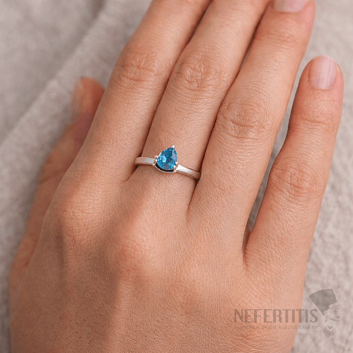 Dominantou prstenu je Swiss Blue topaz o velikosti cca 6 mm, vybroušený do tvaru kapky (pear) s precizním fasetovým brusem, který maximalizuje jeho třpyt a jas.