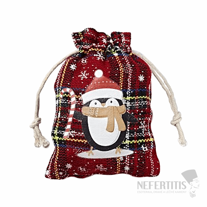 Jutový tartanový sáček Vánoční tučňák se stahovací šňůrkou pro úschovu drobných cenností, kamínků, šperků a k atraktivnímu zabalení a dárků pro ty, které máte rádi. Právě dárkové sáčky a váčky jsou snadnou a levnou alternativou dárkových krabiček. Dopřejte svým oblíbeným drobnostem, šperkům či kamínkům pohodlí a ochranu uvnitř tohoto sáčku. Ilustrativní vyobrazení.