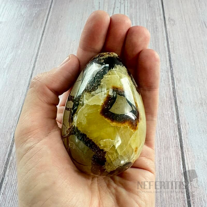 Upozornění: kámen není dokonale ohlazený, nehtem se někdy dají nahmatat vlasové trhlinky, což je vlastností septárie. Z tohoto důvodu nemohou být předmětem případné reklamace.