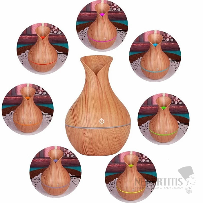 Difuzér svým tvarem připomíná elegantní vázu a jeho světlý dřevodekor dodává interiéru teplo a harmonii. Barevné LED podsvícení jemně prosvěcuje tělo přístroje a přináší příjemné světelné efekty pro relaxaci i spánek.