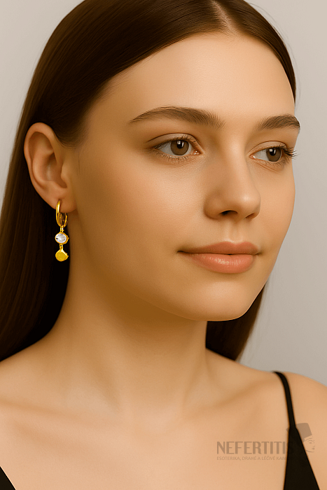Nadčasové pozlacené stříbrné náušnice se zirkonem o délce 2,5 cm vynikají originálním designem, který tvoří dkterý tvoří kruh o průměru 1,2 cm a síle 1,2 mm s přívěskem ve tvaru mušle. Mušle obecně symbolizuje ochranu, ženskost/plodnost, zrod a cestu. Náušnice jsou typu huggie. Huggie náušnice jsou malé kruhové náušnice, které těsně obepínají ušní lalůček a díky zaklapávacímu kroužkovému (pantovému) zapínání se pohodlně nosí po celý den.