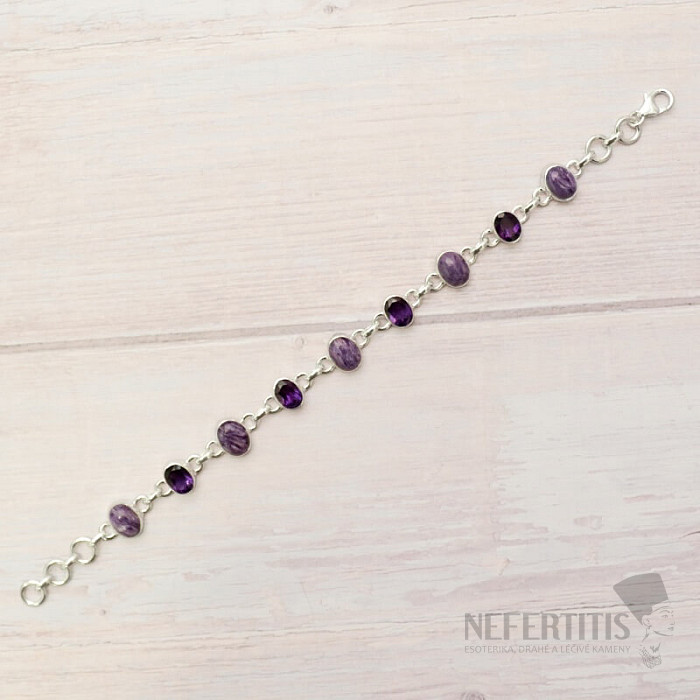 Stříbrný náramek s čaroity krásné kvality a broušenými ametysty. Nádherně fialově zbarvené čaroity vás okouzlí nejen svým hedvábným leskem, ale i proměnou kresby v měnícím se světle. Ag 925. Kupujete přímo vyobrazený šperk.
