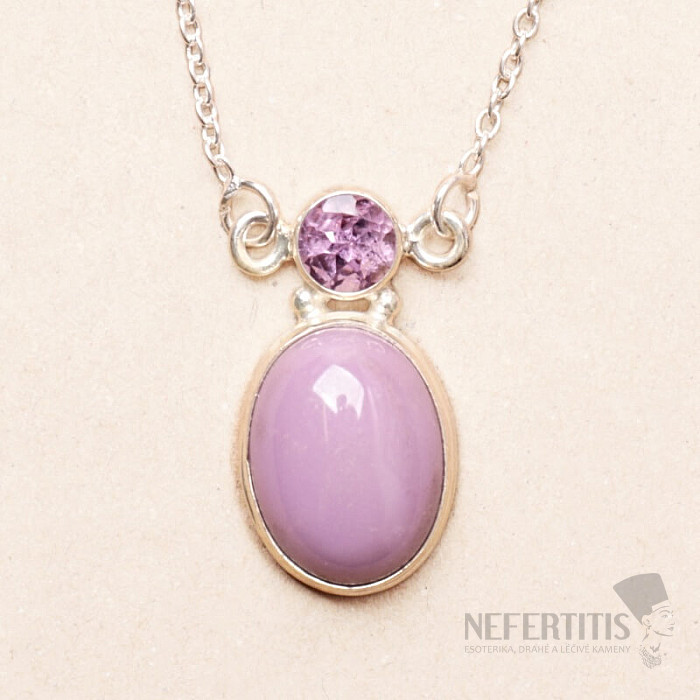 Půbavný stříbrný náhrdelník s fosfosideritem a broušeným ametystem. Ag 925. Fosfosiderit je talismanem používaným pro podpoření touhy najít způsob, jak změnit část života do vytouženého stavu. Fialová je barvou intuice, snů a luxusu. Krásně vybarvený kámen bude ozdobou pro různé příležitosti. Kupujete přímo vyobrazený šperk.