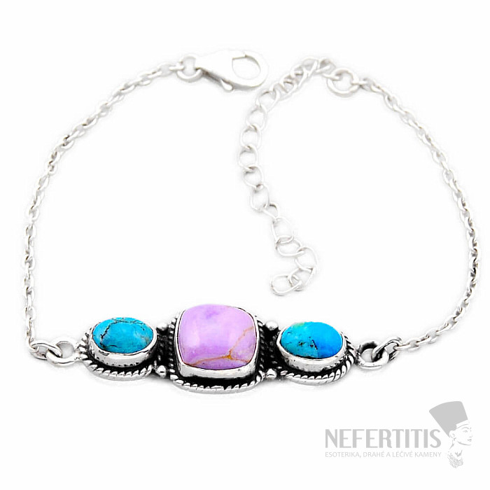 Půbavný stříbrný náramek s fosfosideritem a tyrkysy. Ag 925. Fosfosiderit je talismanem používaným pro podpoření touhy najít způsob, jak změnit část života do vytouženého stavu. Fialová je barvou intuice, snů a luxusu. Krásně vybarvený kámen bude ozdobou pro různé příležitosti. Kupujete přímo vyobrazený šperk.