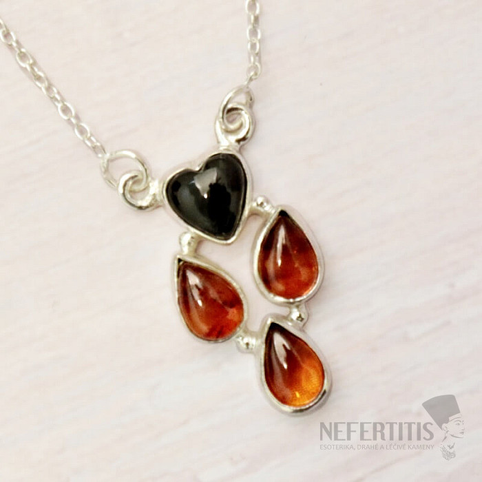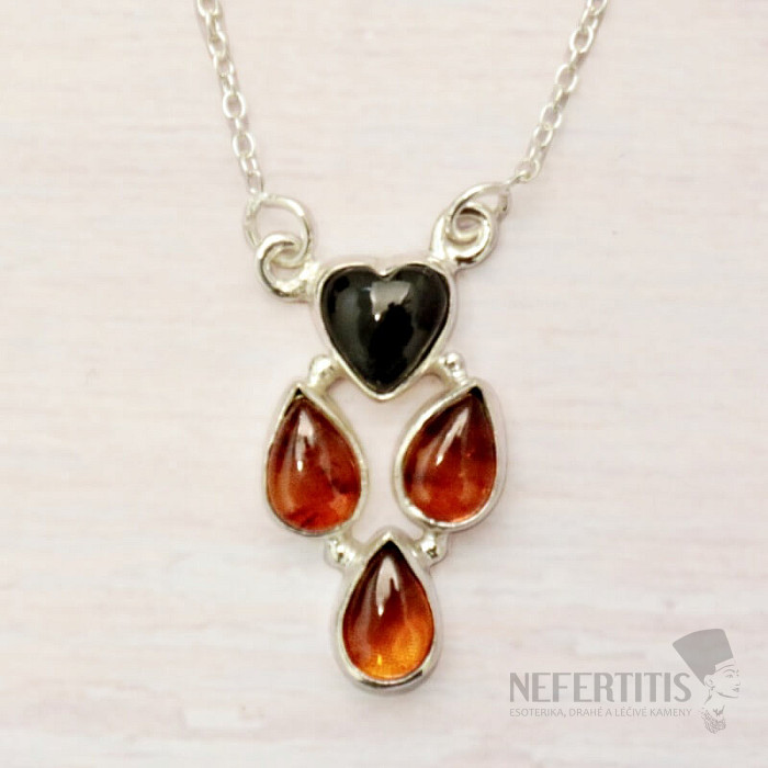 Unikátní stříbrný náhrdelník s kabošony baltského jantaru a onyxem. Velmi optimistický a dobrou náladu již od pohledu dávající šperk. Ag 925. Kupujete přímo vyobrazený šperk.