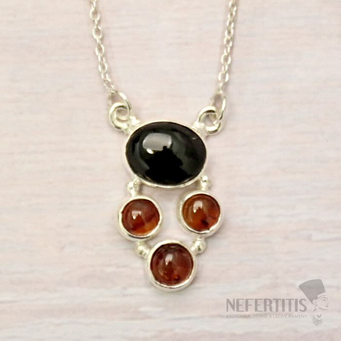 Unikátní stříbrný náhrdelník s kabošony baltského jantaru a onyxem. Velmi optimistický a dobrou náladu již od pohledu dávající šperk. Ag 925. Kupujete přímo vyobrazený šperk.