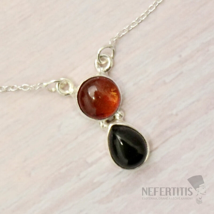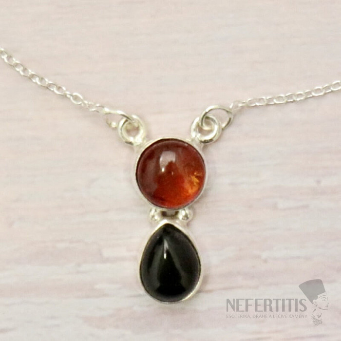 Unikátní stříbrný náhrdelník s kabošonyem baltského jantaru a onyxu. Velmi optimistický a dobrou náladu již od pohledu dávající šperk. Ag 925. Kupujete přímo vyobrazený šperk.