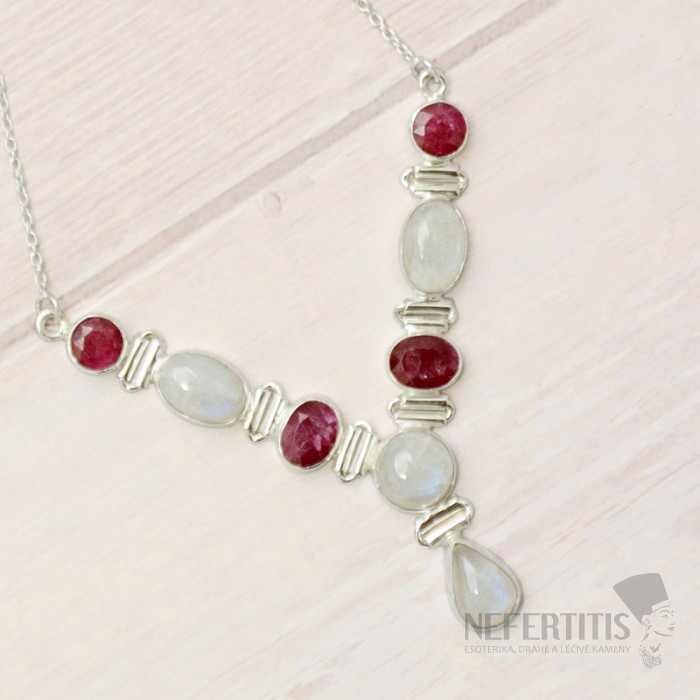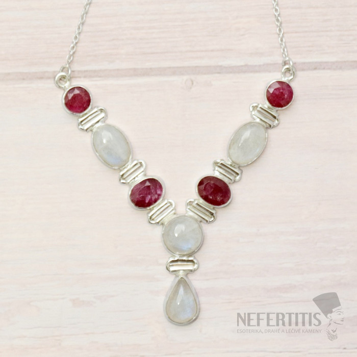 Stříbrný náhrdelník s kabošony měsíčního kamene a broušenými rubíny. Ag 925. Kupujete přímo vyobrazený šperk.