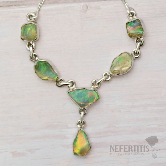 Moderní a elegantní stříbrný náhrdelník ze surového, zaleštěného opálu, s krásnou hrou barev- Ag 925. Působivý a elegantní šperk, od pohledu navozující radost a pocity harmonie. Etiopské opály oproti australským opálům doslova hýří až neonově zářivými odlesky barev. Ačkoliv na první pohled na to nevypadají, ohňostroj barev, který z opálů v tomto náhrdelníku vytryskne při každém dopadu světla, okouzlí nejen vás, ale celé vaše okolí. Kupujete přímo vyobrazený šperk.