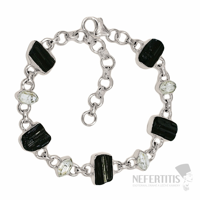 Atraktivní, elegantní, až trochu tajemný náramek ze surového černého turmalínu skorylu a s herkimer diamanty ve stříbře. Černá barva turmalínu, která krásně kontrastuje s leskem stříbrného rámečku, dává tomuto nármaku eleganci a činí z něj velmi dekorativní šperk. Černé surové turmalíny běžně obsahují prasklinky, je to jejich charakteristický rys a důkaz, že kupujete pravý přírodní tumalín. Ag 925. Kupujete přímo vyobrazený šperk.