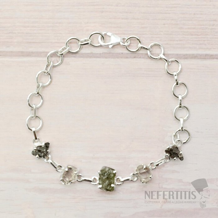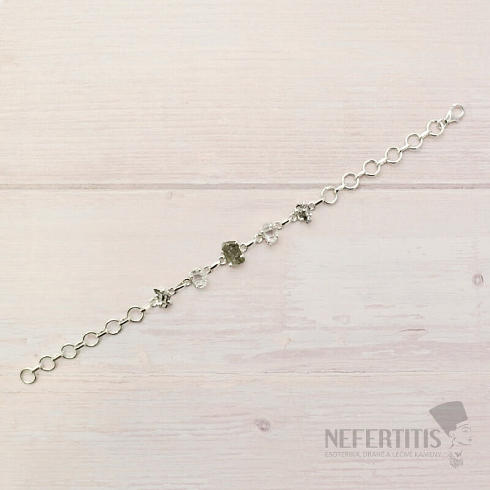 Atraktivní stříbrný náramek s vltavíny, Herkimer diamanty a meteority Campo del Cielo. Ag 925. Kupujete přímo vyobrazený šperk.