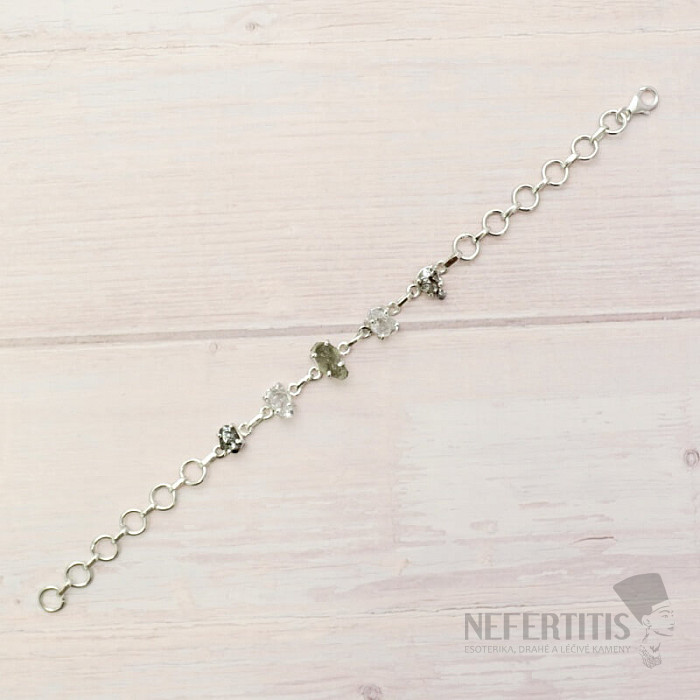Atraktivní stříbrný náramek s vltavíny, Herkimer diamanty a meteority Campo del Cielo. Ag 925. Kupujete přímo vyobrazený šperk.