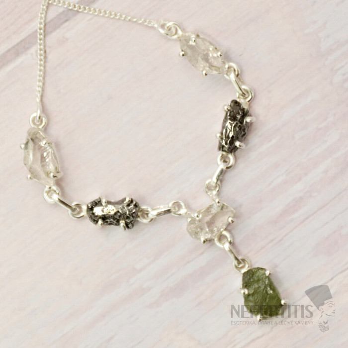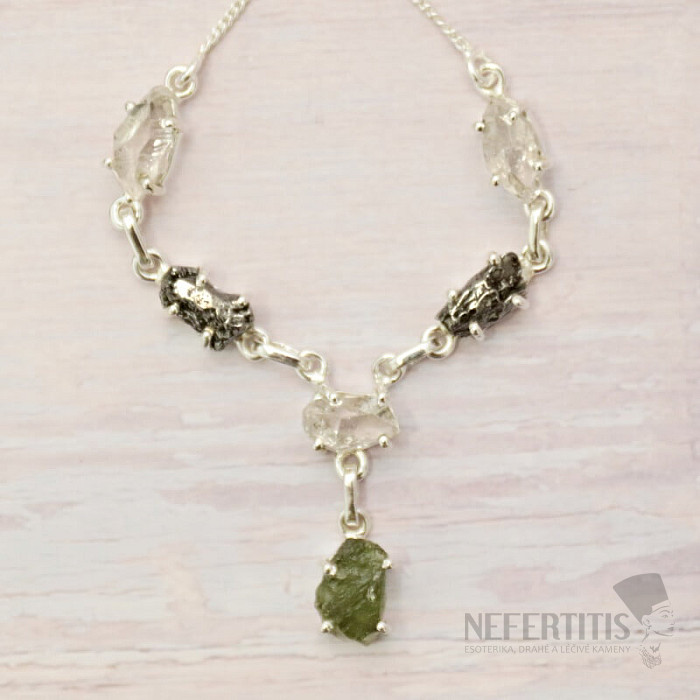 Vltavín, Herkimer diamant a meteorit náhrdelník stříbro Ag 925 LOT36