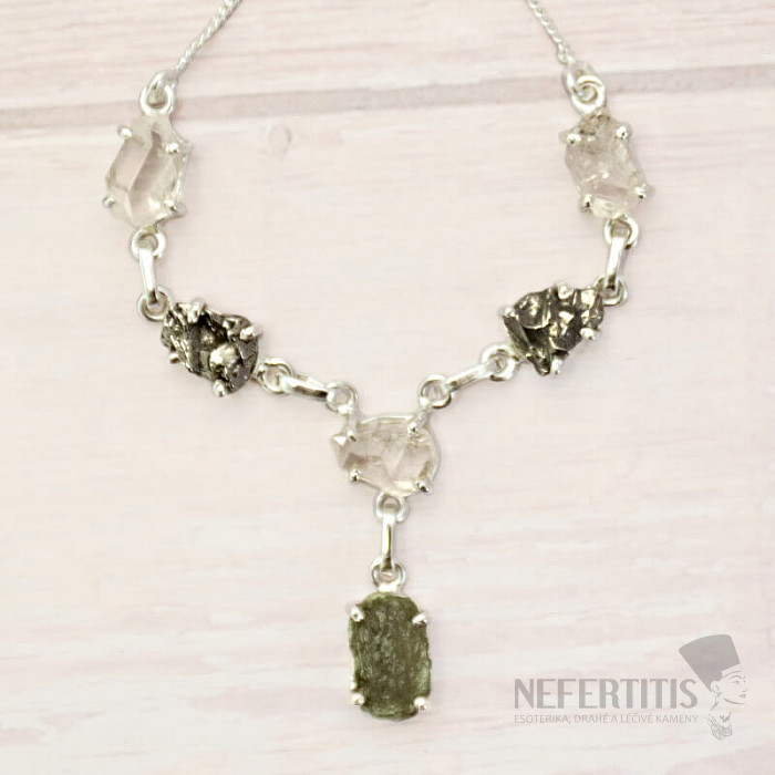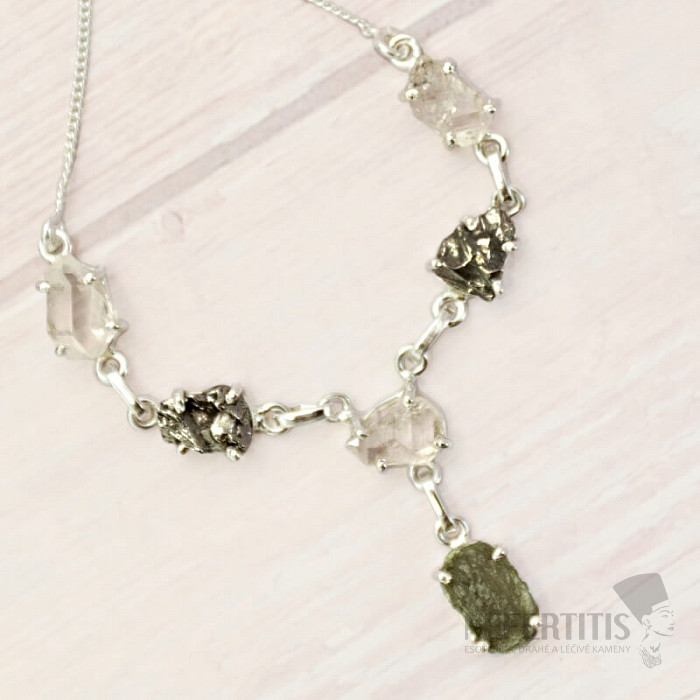 Vltavín, Herkimer diamant a meteorit náhrdelník stříbro Ag 925 LOT37
