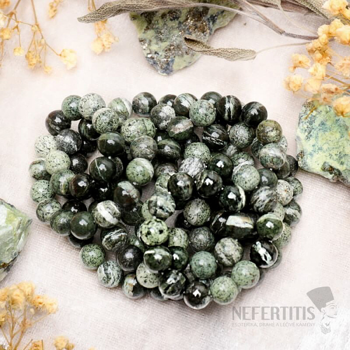 Unisex náramek z korálků z chryzotilu zaujme svým přirozeným zeleným odstínem a jemnou kresbou minerálu. Minimalistické provedení se snadno kombinuje s každodenním i elegantnějším outfitem. Díky univerzálnímu designu je vhodný pro muže i ženy a stane se nadčasovým doplňkem vaší sbírky šperků.