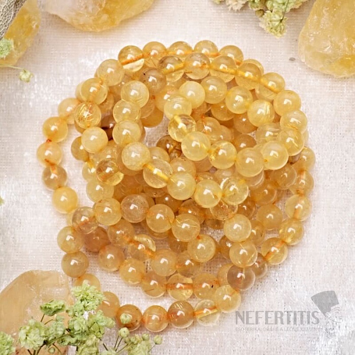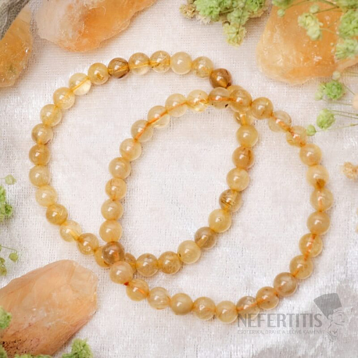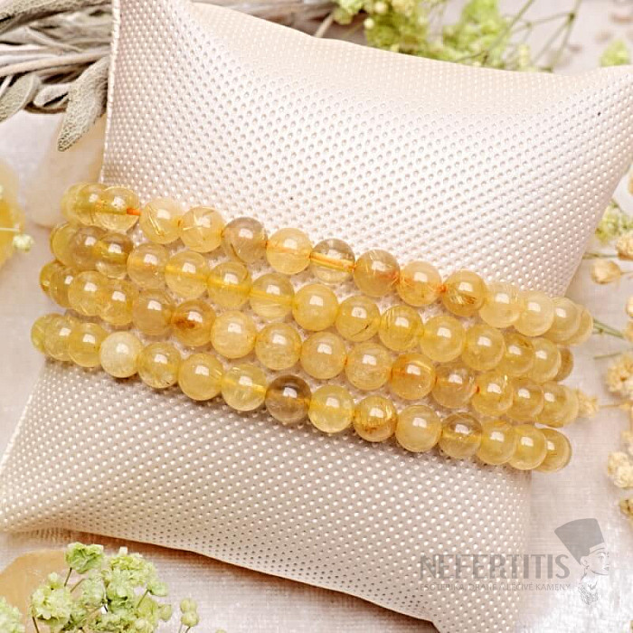 Luxusní náramek ze sagenitu (zlatého rutilu v křemeni) okouzlí svou jedinečnou kresbou zlatých jehliček uzavřených v čirém křemeni. Každý korálek je malým přírodním originálem, který dodává náramku elegantní a zároveň výjimečný vzhled.