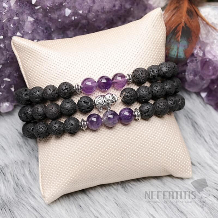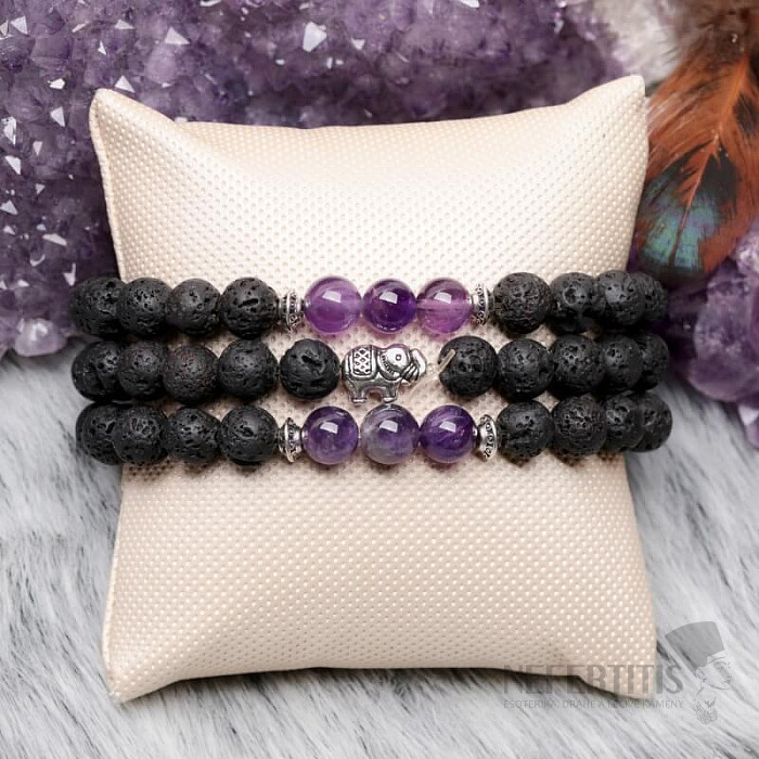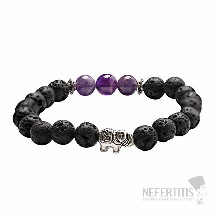 Krásný náramek z korálků přírodního lávového kamene. Korálky z tmavě fialového ametystu. Ametystové korálky jsou od lávových korálků oděleny kovovou aplikací. V náramku je vložen kovový korálek z obecného kovu ve tvaru slona, který je symbolem krásy, tiché síly, majestátnosti a laskavosti. Korálky jsou navlečeny na nylové gumičce neutrální barvy. Průměr korálků cca 8 mm. Ilustrativní vyobrazení.