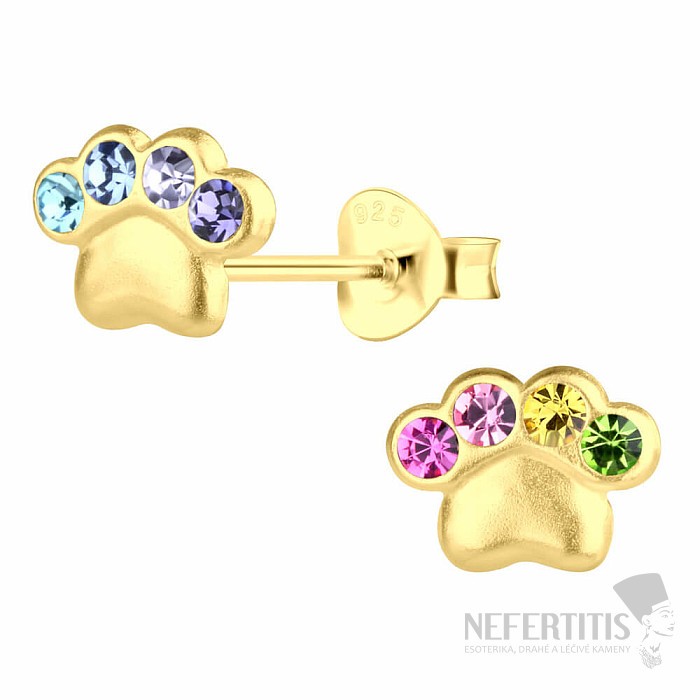 Tyto stříbrné náušnice pecky 925/1000 jsou tvarovány do oblíbeného motivu tlapky a osazeny čtyřmi barevnými kubickými zirkony, které vytvářejí jemný, ale nepřehlédnutelný třpyt. Povrch náušnic je pozlacen 14karátovým zlatem a následně chráněn vrstvou e-coating, která zajišťuje dlouhodobou krásu a odolnost.