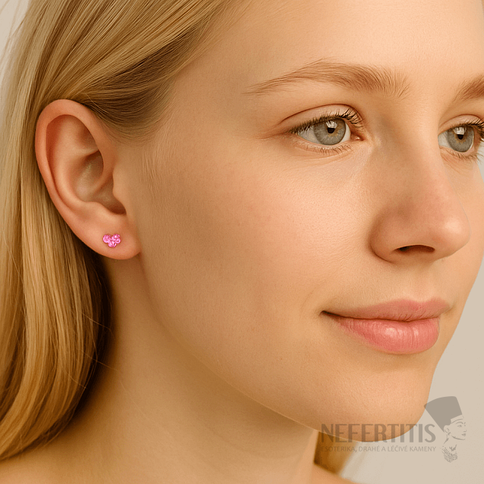Tyto jemné stříbrné náušnice typu pecky jsou vyrobeny ze stříbra ryzosti 925/1000 a osazeny růžovými zirkony o průměru 4 mm ve tvaru srdce. Jejich hmotnost činí 0,5 g, což z nich dělá lehký a pohodlný šperk pro každodenní nošení. Puzetové zapínání.