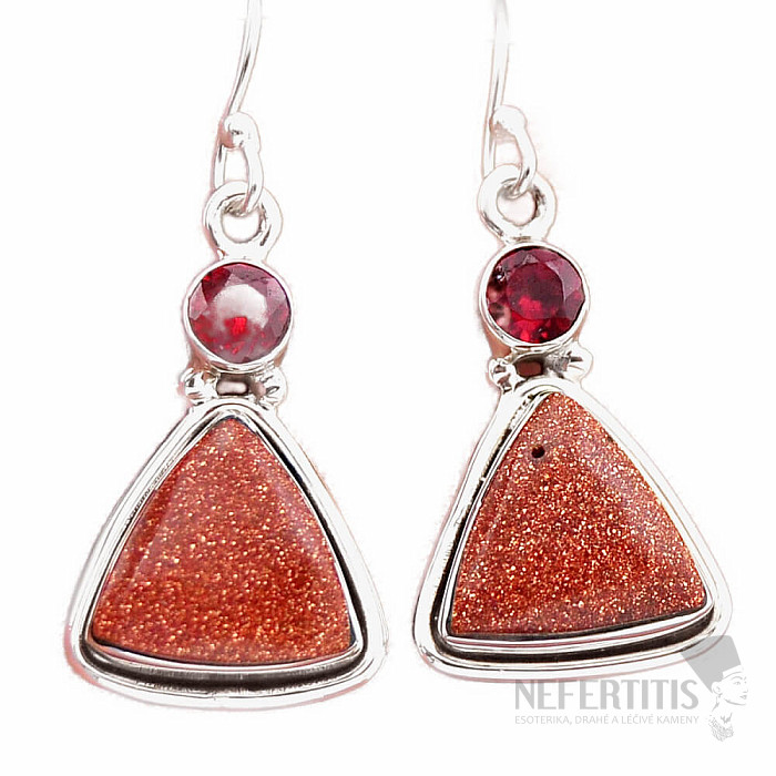 Stříbrné náušnice se slunečním avanturínem a broušeným granátem. Ag 925. Uvedená váha je celého páru. Kupujete přímo vyobrazený pár.