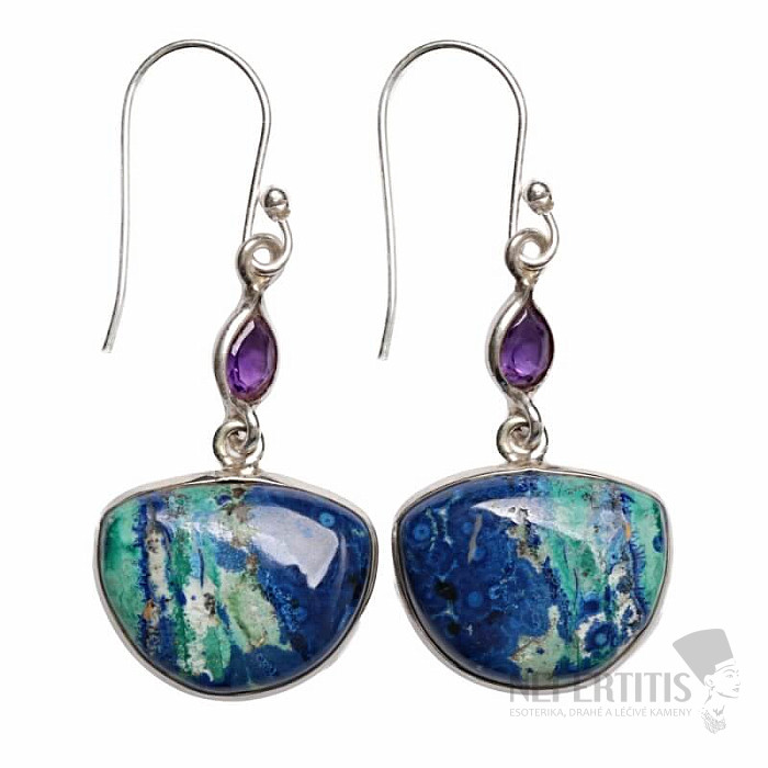 Exkluzivní, okouzlující stříbrné náušnice s azuritem v malachitu a broušeným ametystem. Kombinace azuritu s malachitem připomínající pohled na planetu Zemi z ptačí perspektivy činí tento šperk nevšedním a velmi dekorativním. Ag 925. Kupujete přímo vyobrazený šperk.