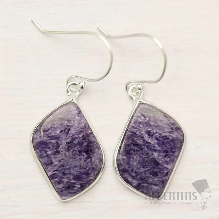 Výrazné stříbrné náušnice z čaroitu výborné kvality. Ag 925. Nádherně fialově zbarvený čaroit vás okouzlí nejen svým hedvábným leskem, ale i proměnou kresby v měnícím se světle. Uvedená váha je celého páru. Kupujete přímo vyobrazený šperk.