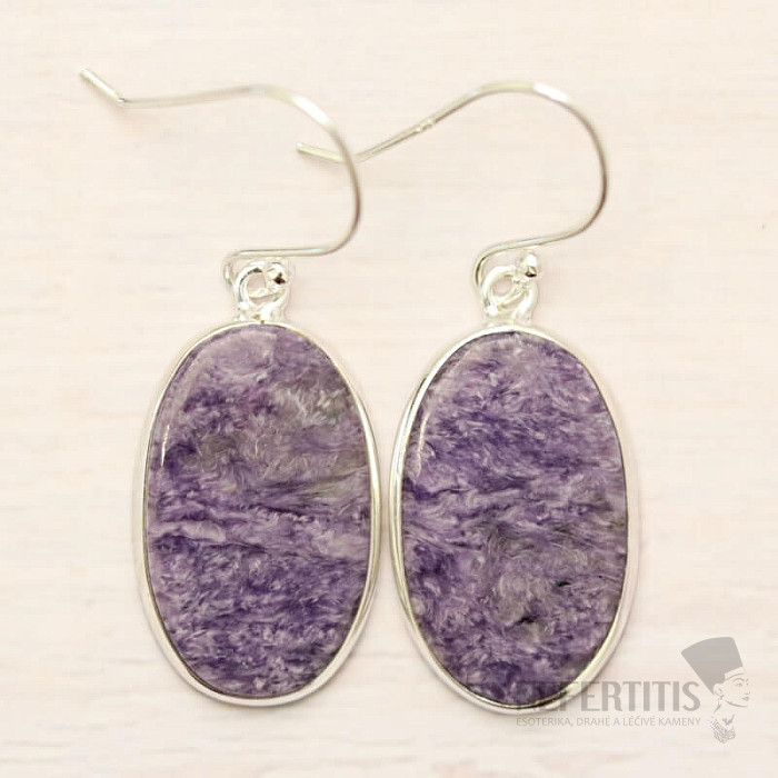 Výrazné stříbrné náušnice z čaroitu výborné kvality. Ag 925. Nádherně fialově zbarvený čaroit vás okouzlí nejen svým hedvábným leskem, ale i proměnou kresby v měnícím se světle. Uvedená váha je celého páru. Kupujete přímo vyobrazený šperk.