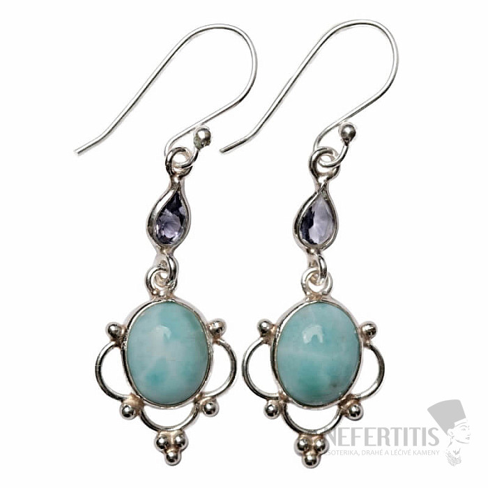 Atraktivní stříbrné designové náušnice s larimary a broušenými iolity. Ag 925. Uvedená váha je celého páru. Kupujete přímo vyobrazený šperk.