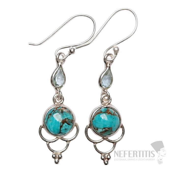 Atraktivní stříbrné designové náušnice s kousky tyrkysu spojovaných mědí do působivých kabošonů tyrkysově modré barvy. Tento typ šperků získává ve světě na velké oblibě z důvodu stále rostoucí ceny jednolitých kusů přírodního tyrkysu. Tyrkys ve špercích nosí štěstí a podporuje lásku. Měď je od nepaměti používáná jako silný léčivý prostředek v mnoha kulturách po celém světě. První zmínka o léčivých účincích mědi je již na egyptském papyru z období 2600 až 2200 let před Kristem. Ag 925. Tyrkys je doplněn broušeným topazem. Uvedená váha je celého páru. Kupujete přímo vyobrazený šperk.
